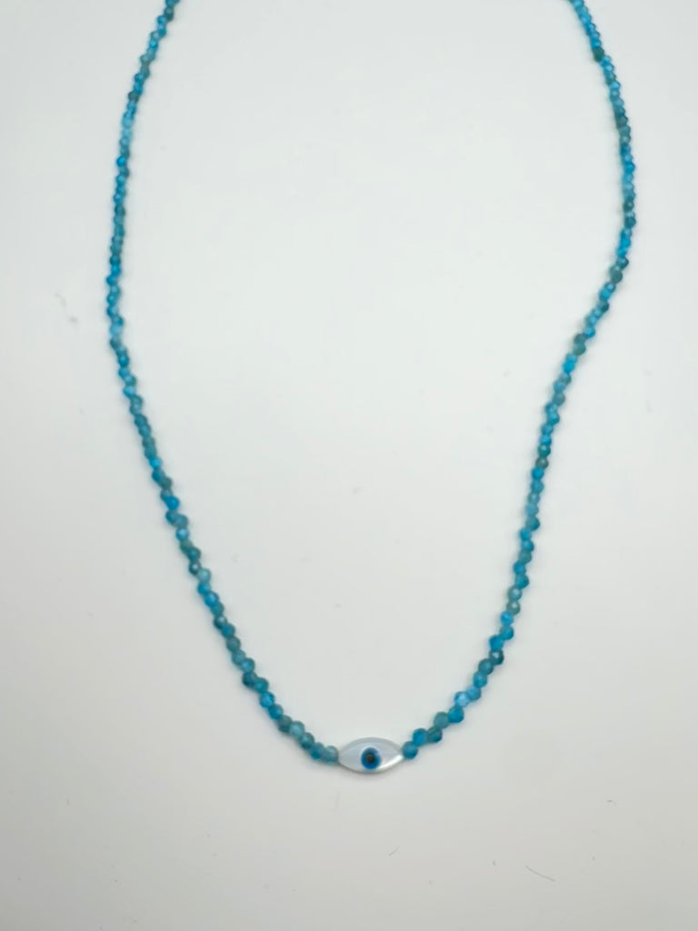 Small evil eye (mati) mother of pearl with cerulean blue apatite gemstone bead necklace.