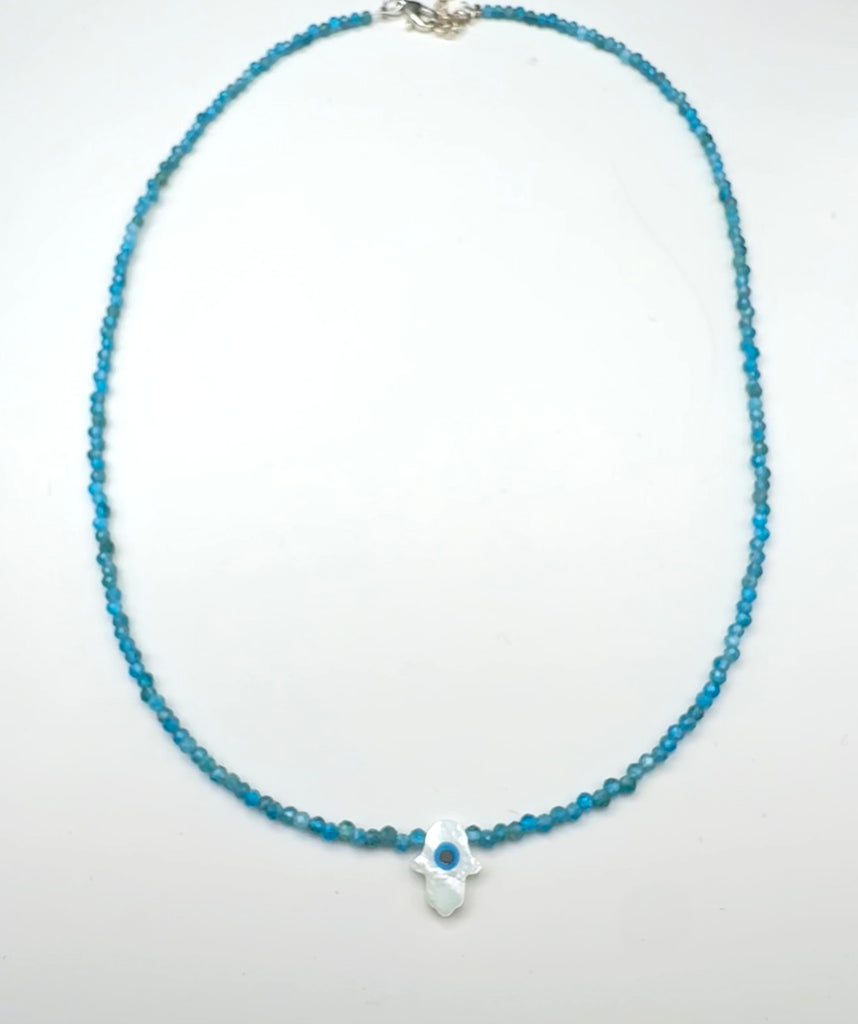 Small evil eye (mati) mother of pearl with cerulean blue apatite gemstone bead  necklace.